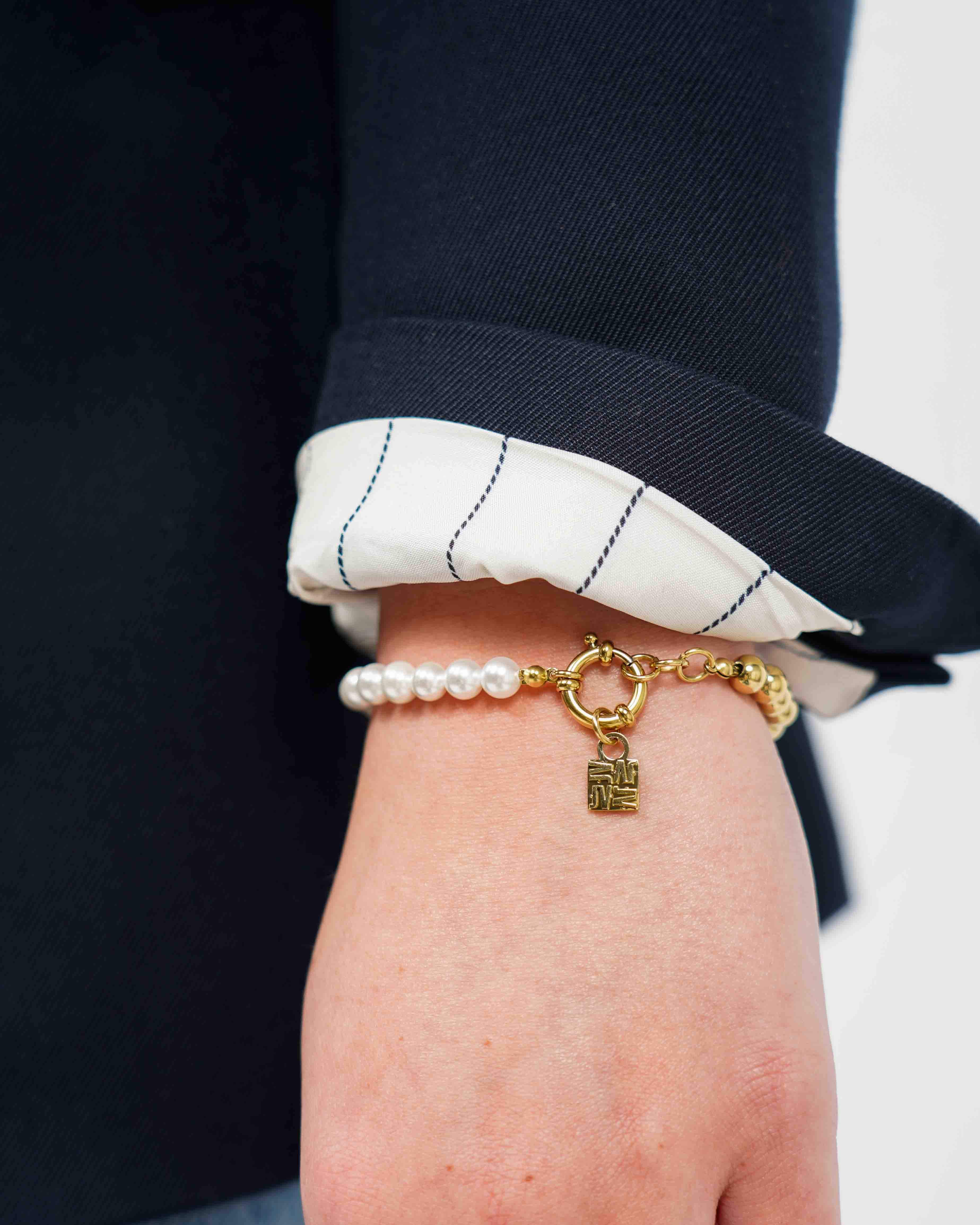 Voeg een vleugje luxe toe aan je outfit met de elegante *Eleia* armband. Deze verfijnde *accessoire* is een ware must-have voor iedere modebewuste vrouw. Met zijn subtiele gouden en parelmoer afwerking, straalt de armband tijdloze elegantie uit. Perfect voor zowel speciale gelegenheden als voor dagelijks gebruik.
