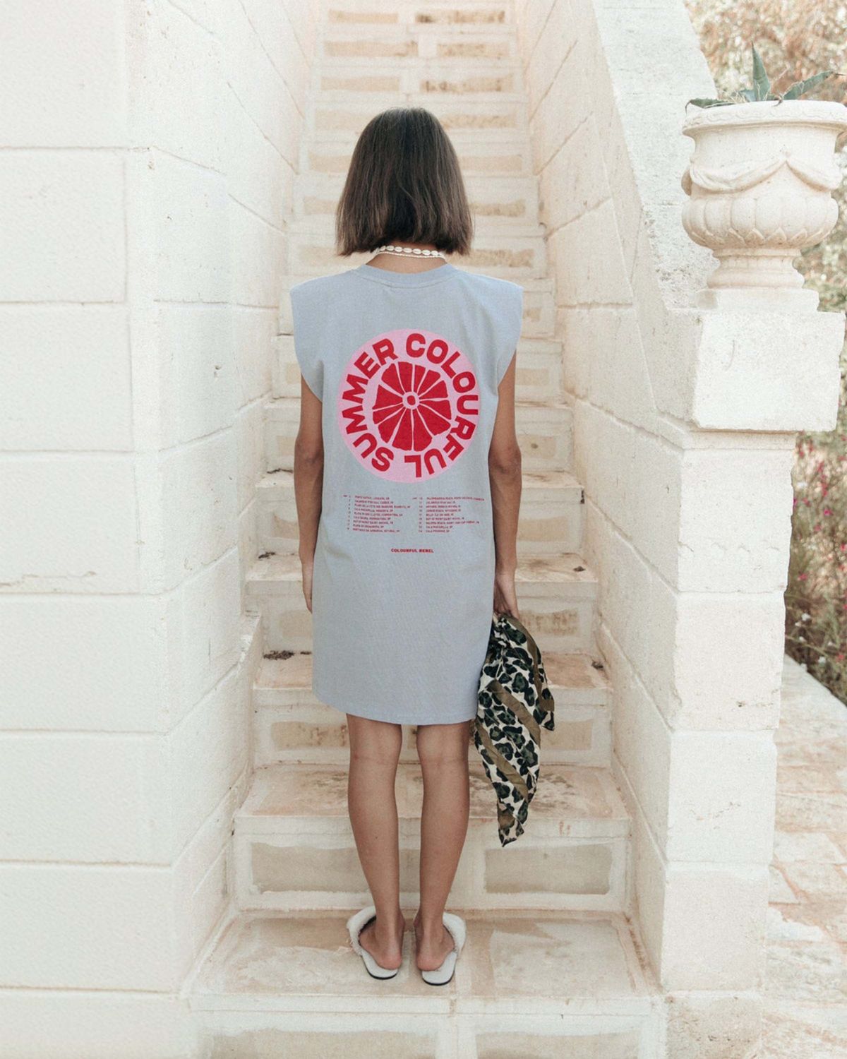 De grijze kleur met een opvallend design aan de achterkant maakt het een echte eyecatcher. Of je nu naar het strand gaat of een dagje de stad in trekt, deze jurk past bij elke gelegenheid. Een absolute must-have voor de modebewuste vrouw die houdt van een speelse en unieke look.