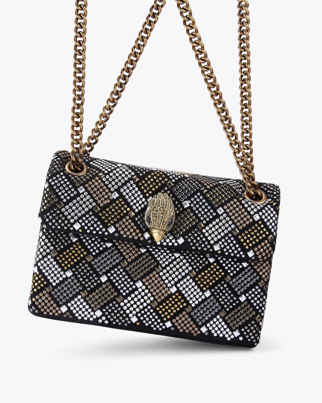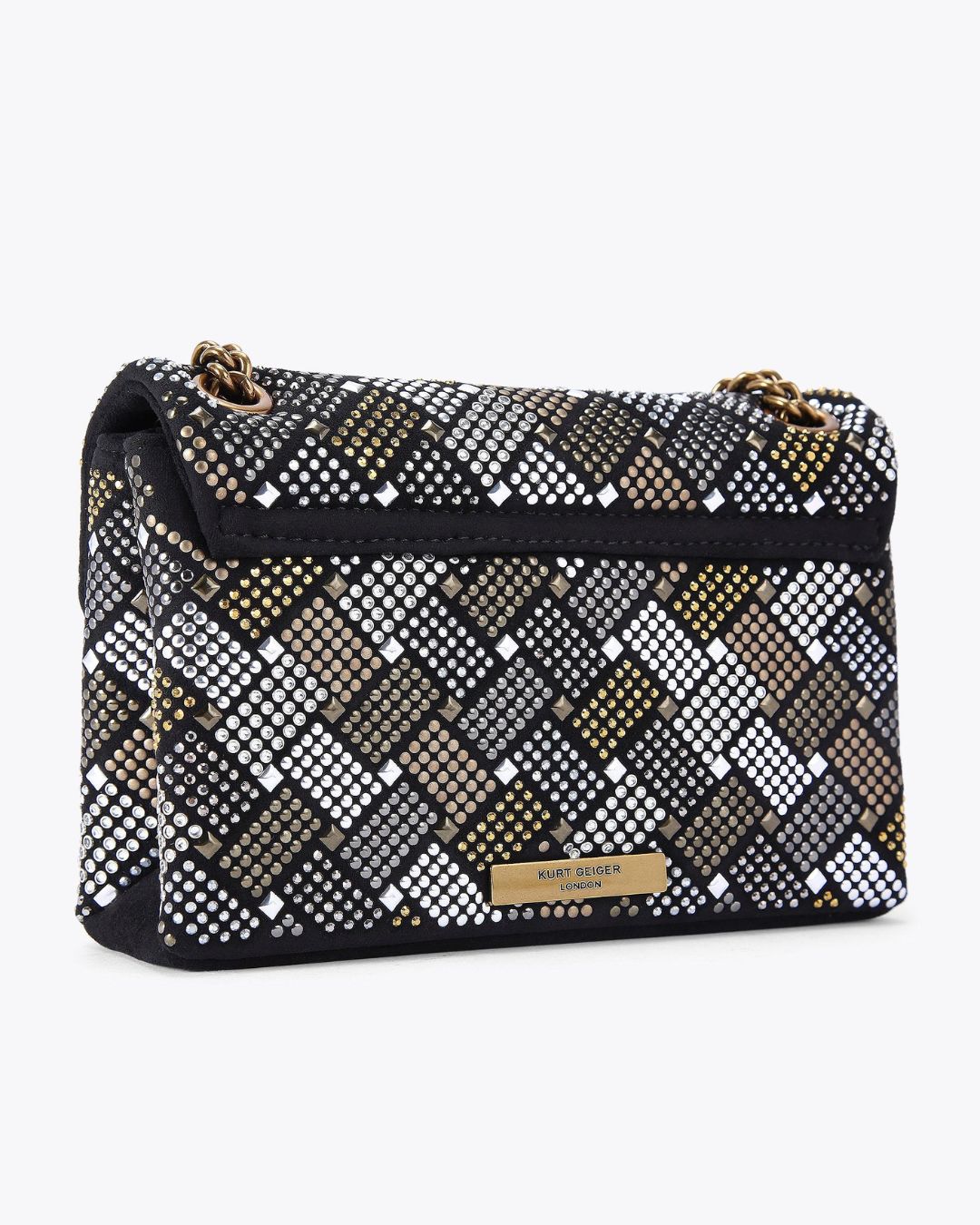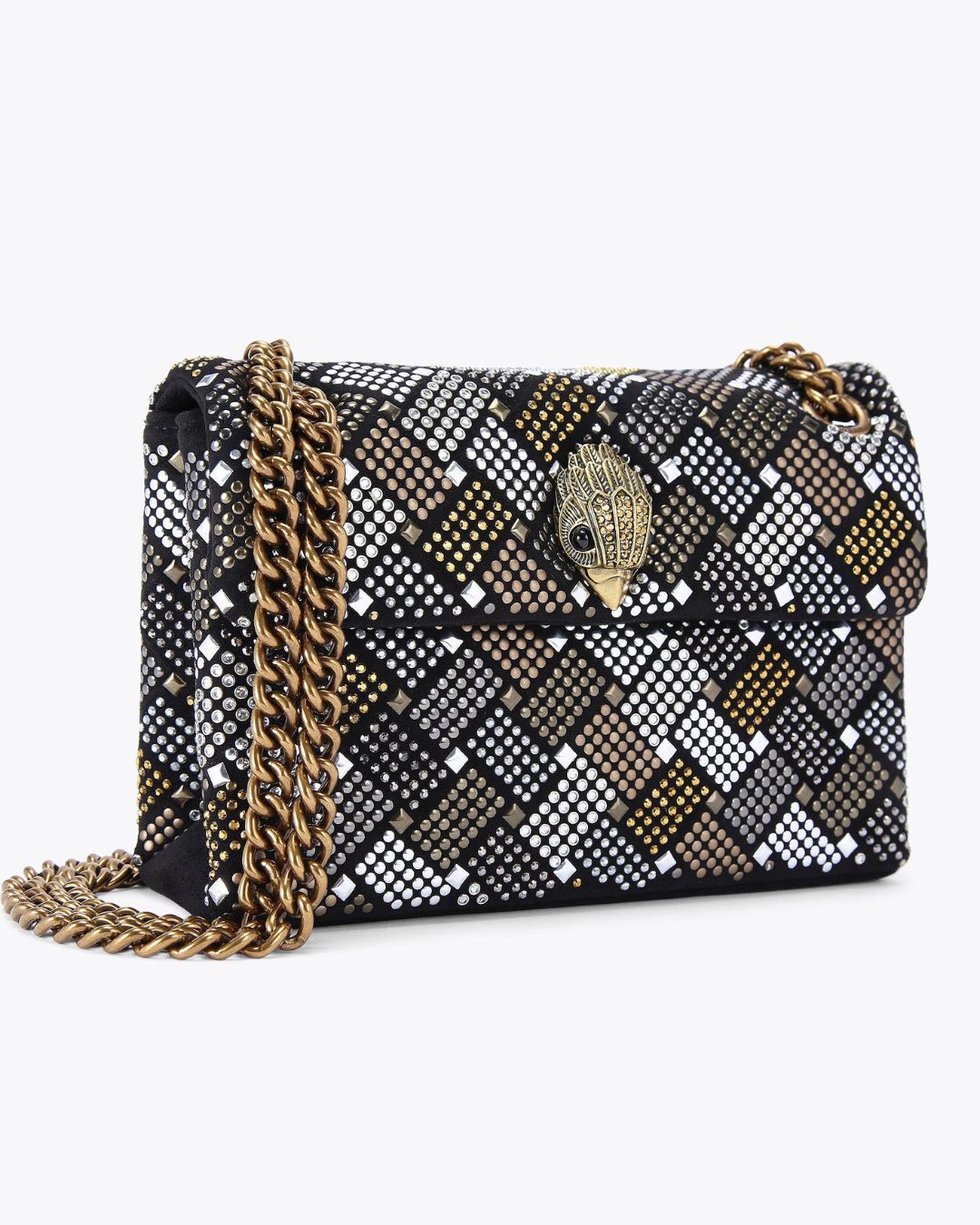 Ontdek de subtiele elegantie en veelzijdigheid van de Fabric Mini Kensington schoudertas. De iconische stijl van Kurt Geiger komt tot leven in deze verfijnde tas, perfect voor elke gelegenheid. Met een eigentijdse ruitvormige textuur en een luxe goudkleurige kettingriem, biedt deze tas zowel stijl als functionaliteit.