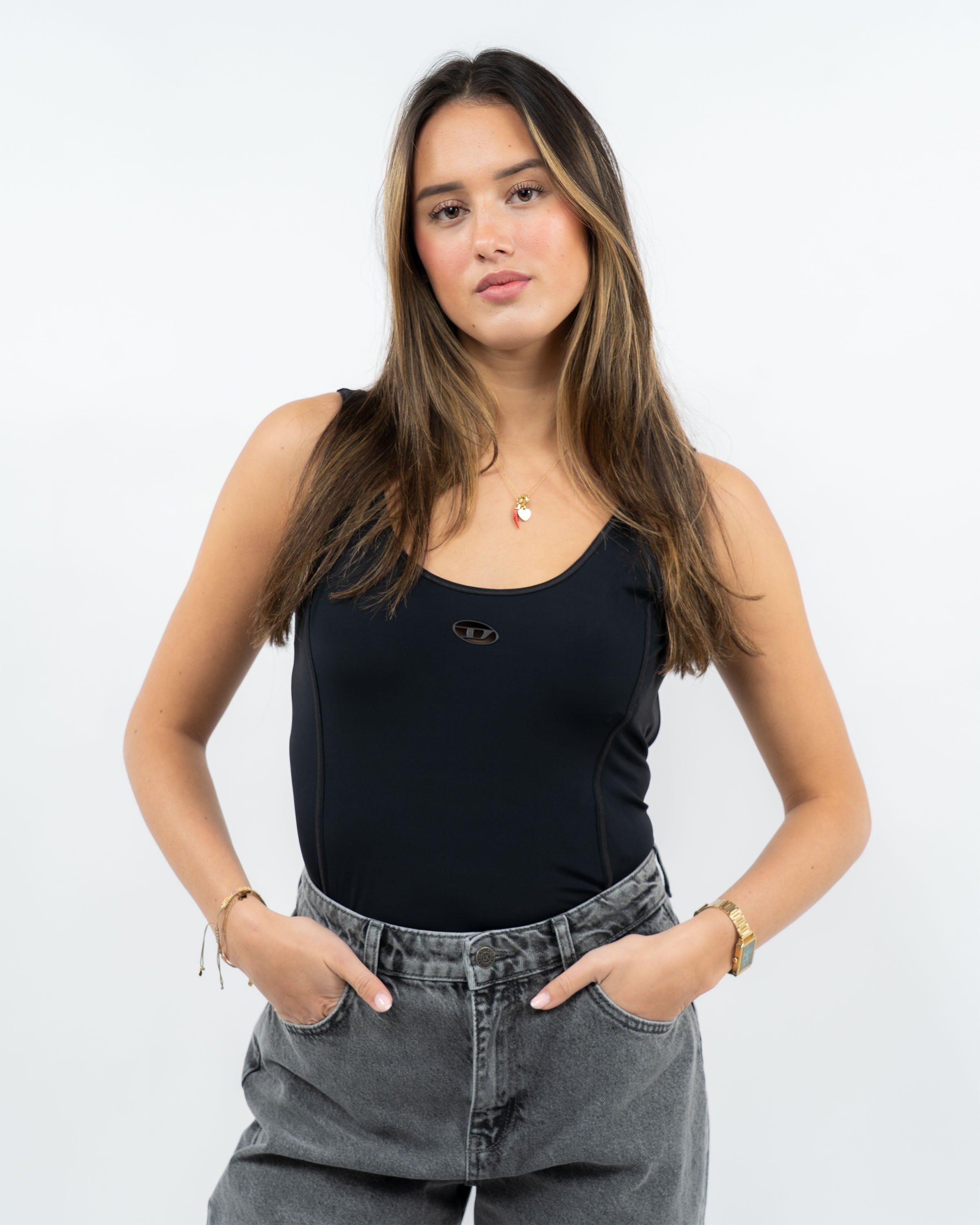 Ontdek de edgy stijl van de *Rachele Uw Body* in stoer zwart. Deze Diesel body is ontworpen voor vrouwen die durven. Met een *mouwloos model* dat je silhouet accentueert, is het de perfecte keuze voor iedere urban look. Het zachte materiaal geeft je een comfortabele pasvorm, terwijl de aansluitende snit zorgt voor een strakke look.
